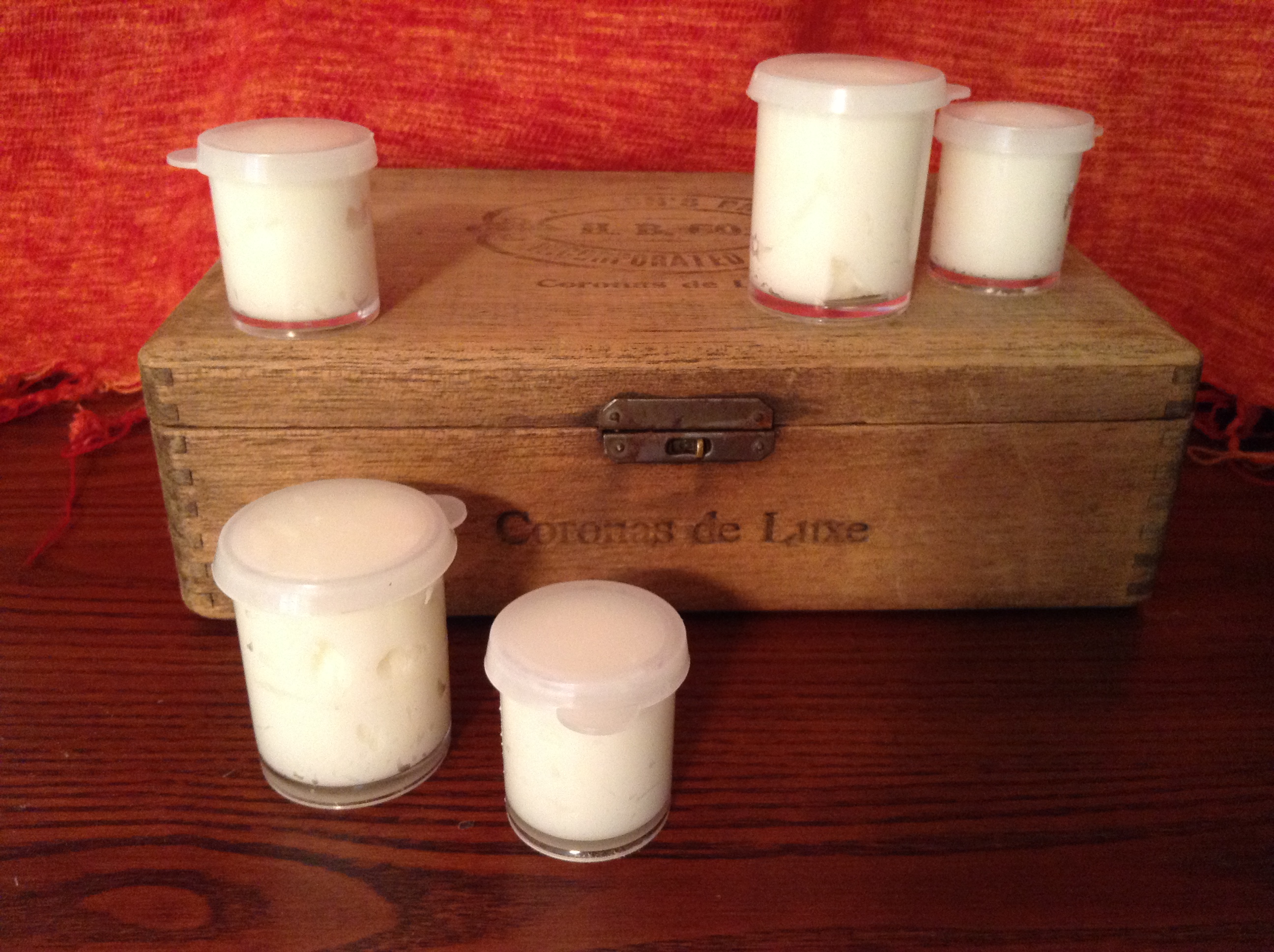 I packed the product into tiny plastic jars and, because the stuff smells so yummy, I even licked my fingers. I don’t advise that. In fact, I don’t advise you make this goop at all; it’s unpleasantly grainy to the touch, it bleeds oil from the container, and I’m not even sure it works. I’m reverting to my (slightly less hip) mineral deodorant stone.